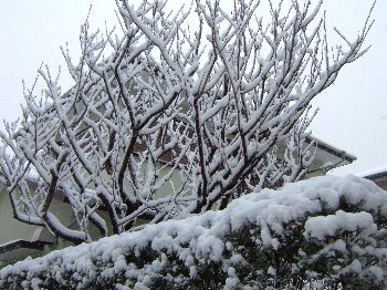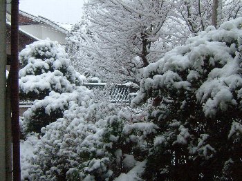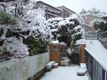 1/21雪お天気・8年ぶりの積雪です。雪かきに奮闘しました。雪景色と対比した写真2枚掲載する。